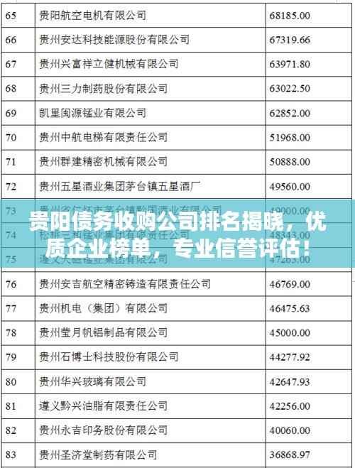 随着经济的发展和金融市场的繁荣,债务收购行业逐渐崭露头角,在贵阳这座美丽的城市,债务收购公司如雨后春笋般涌现,本文将为您介绍贵阳债务收购公司的排名,以帮助您更好地了解这一领域的市场状况。