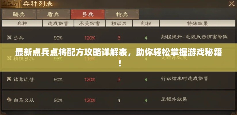 随着游戏产业的飞速发展,各种游戏的攻略和配方也应运而生,在众多游戏中,“点兵点将”作为一种策略性极强的玩法,受到了广大玩家的热烈追捧,本文将为大家带来一份最新“点兵点将配方攻略表”,帮助大家在游戏中更好地掌握技巧,提升胜率。