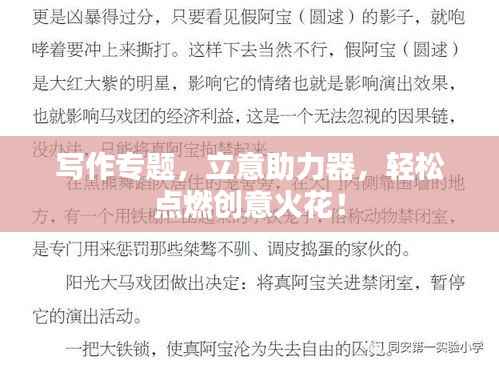 写作是一个复杂的过程,其中立意是至关重要的一环,立意即确定文章的主题和核心思想,为整篇文章定下基调,一个好的立意能使文章深刻、独特,反之则可能导致文章平淡无奇或偏离主题,本专题将探讨如何帮助写作者更好地立意,从而创作出优秀的作品。