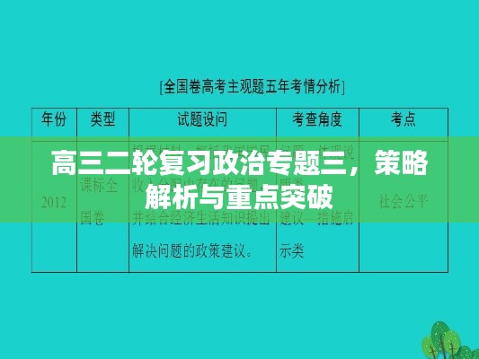 随着高考的临近,高三二轮复习已经如火如荼地展开,对于政治学科的学习,专题三的学习无疑是整个复习过程中的重要环节,本文将围绕“高三二轮复习政治专题三”这一主题,就学习策略与重点解析进行深入探讨。