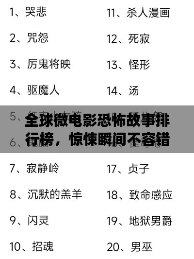 随着影视文化的不断发展,微电影作为一种新兴的影视艺术形式,以其短小精悍、富有创意的特点,吸引了众多观众的关注,而在微电影领域中,恐怖题材的微电影更是因其独特的叙事方式和惊悚氛围的营造,成为许多人心目中的经典之作,本文将介绍世界微电影恐怖故事排名,带您领略那些令人毛骨悚然却又难以忘怀的恐怖佳作。