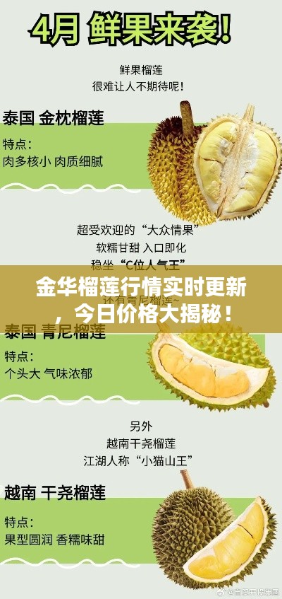 榴莲作为一种热带水果,近年来在中国市场的需求量逐渐增加,金华作为浙江省的一个重要城市,榴莲的销售市场也日渐繁荣,本文将为您介绍金华榴莲的最新行情及价格动态。