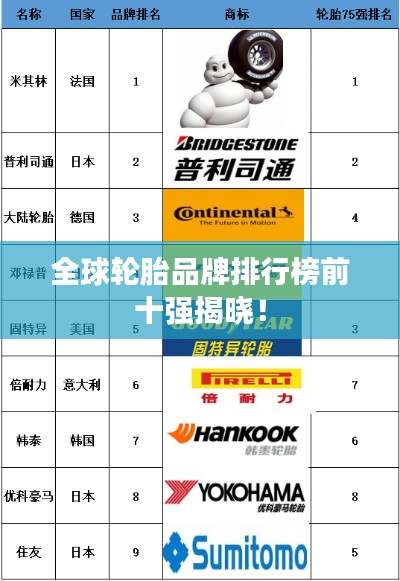 轮胎作为汽车的重要组成部分,其品质与性能直接影响着车辆的行驶安全与舒适度,在众多的轮胎品牌中,哪些品牌跻身世界轮胎排名前十呢?我们将一一揭晓。