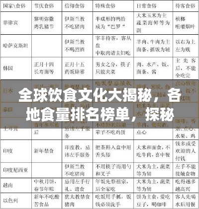 世界食量排名不仅仅是一个简单的数字榜单,更是全球各地饮食文化的展现,本文将带您走进这个充满魅力的饮食世界,探究各国人民的食量背后的文化、历史和生活方式。