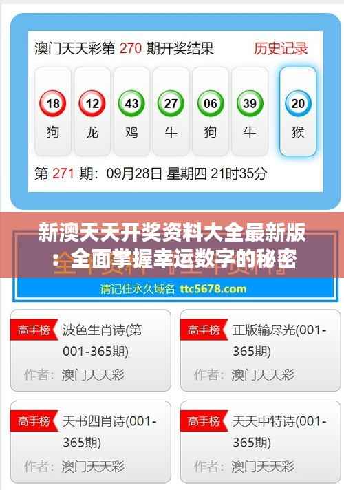 在澳门博彩业繁荣的发展背景下,彩票玩法多样,其中新澳天天开奖以其高频次开奖和公平公正的特点受到大众的喜爱和追捧。然而,尽管许多人对彩票感兴趣,却很少有人能够全面掌握幸运数字的奥秘。本文将带您详细了解新澳天天开奖资料大全最新版,并揭示幸运数字背后的秘密,帮助您在彩票世界中找到更多的乐趣和机会。